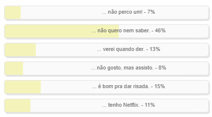 “Começou o horário eleitoral e eu...” Enquete com essa “pergunta” foi encerrada neste domingo. Venceu (disparado) a alternativa “...não quero nem saber”, com 46% dos votos. Em segundo ficou “...é bom para dar risada”, com 15%, e, em terceiro, “...verei quando der”, com 13%. O resultado completo está no quadro acima.