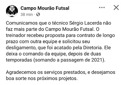 Sérgio Lacerda não é mais técnico do Campo Mourão Futsal.