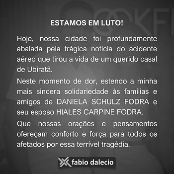 Um casal de Ubiratã está entre as vítimas do acidente aéreo que matou 61 pessoas na tarde desta sexta-feira. Daniela Schulz Fodra e Hiales Carpine Fodra embarcaram em Cascavel no voo que iria para Guarulhos/SP, mas caiu em Vinhedo/SP. O casal estava de viagem para os Estados Unidos O prefeito Fábio D’Alécio postou nota lamentando o ocorrido.