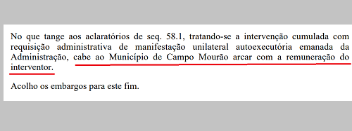 “A medida liminar determinou transparência completa à intervenção, de modo que ao interventor e ao Município cabe explicar o alegado déficit mensal, os indigitados atrasos em pagamentos de fornecedores e a integral disponibilização de todas as despesas e receitas no Portal da Transparência, indicando a evolução do Plano de Trabalho e os impactos financeiros experimentados pelo Poder Público, inclusive quanto às fontes de recursos e aos resultados financeiros eventualmente negativos que a intervenção tem ou não causado ao erário. É uma questão de responsabilidade fiscal e administrativa”.