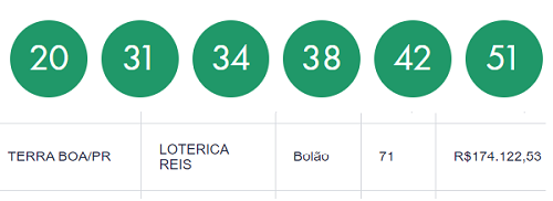 Uma aposta de Várzea Paulista/SP foi a única que acertou as seis dezenas da Mega Sena sorteadas nesta terça-feira. Levou o prêmio que estava acumulado em R$ 62 milhões. A quina teve 62 apostas ganhadoras, mas apenas uma do Paraná. Foi um bolão de 71 cotas feito na lotérica Reis, em Terra Boa. Prêmio? R$ 174,1 mil.