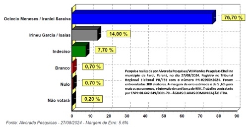 Pesquisa realizada por Alvorada Pesquisas/WJ Mendes Pesquisas Eireli. Registro no Tribunal Regional Eleitoral PR/TSE com o número PR-02080/2024. Trabalho contratado por CNPJ 08.642.849/0001-70 – Águas Claras Comunicação Ltda.