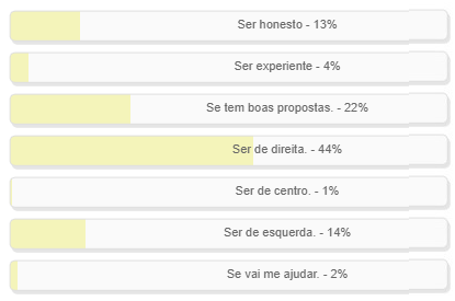 “O que pesa para você decidir seu candidato?” Enquete foi encerrada neste domingo. Vitória para a alternativa “Ser de direita”, com 44% dos votos. “Ter boas propostas” ficou em segundo, com 22%. “Ser de esquerda” apareceu em terceiro, com 14%. “Ser honesto” teve 13% dos votos. O resultado completo está no quadro a acima
