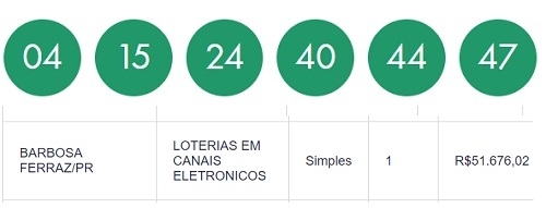 Ninguém acertou as seis dezenas da Mega Sena sorteada nesta terça-feira. Assim, o prêmio que já estava acumulado em R$ 61 milhões deve chegar a R$ 65 milhões no sorteio da próxima quinta-feira. A quina teve 65 apostas ganhadoras e cada uma vai levar o prêmio de R$ 51,6 mil. Uma delas é de Barbosa Ferraz, feita em canais eletrônicos.