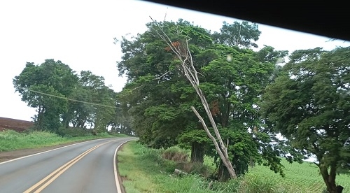 Árvore pendurada, só tá enroscada em um galhinho, no jeito de dar um acidente rodovia entre Campo Mourão e Luiziana (depois da reserva da hidrelétrica, cerca de 150 metros à direita).