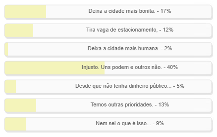”Qual a sua opinião sobre a instalação de parklets nas ruas da cidade?” Enquete com esta pergunta teve votação encerrada neste domingo. Venceu a alternativa “Injusto. Uns podem e outros não”, com 40% dos votos. “Deixa a cidade mais bonita” ficou em segundo, com 17%. “Temos outras prioridades” fechou o pódio, com 13%. O resultado completo está no quadro acima.