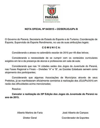 “A Secretaria de Estado do Esporte e do Turismo ‘simplesmente’ cancelou os jogos”, frisa a nota.