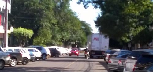 “Às 10h50 de sexta-feira, caminhão para em fila dupla para fazer descarga na rua Brasil, no centro de Campo Mourão, bem em frente à prefeitura”.