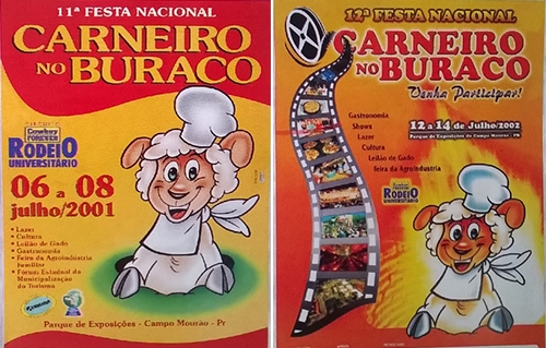 ...para o prato típico de Campo Mourão ser servido na 25.a Festa Nacional do Carneiro no Buraco. Os cartazes acima são, respectivamente, da 11.a e da 12.a edição do evento. A primeira de 6 a 8 de julho de 2001 e a segunda de 12 a 14 de julho de 2002. Além do carneiro, o destaque continuava sendo o rodeio universitário e a festança toda tinha apenas três dias.