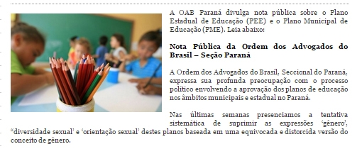 O OAB do Paraná criticou a forma “equivocada e distorcida” como conceito “gênero” foi tratado nos PMEs.