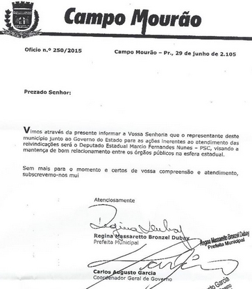 Ofício com essa informação foi assinado nesta segunda-feira pela prefeita Regina Dubay.