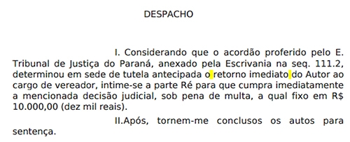 O juiz substituto da 1ª Vara Cível de Campo Mourão, Cezar Ferrari, mandou dar posse imediata ao vereador cassado Pedrinho Nespolo.