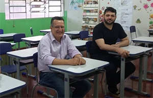O que é isso? O prefeito de Peabiru, Claudinei Minchio, e o secretário Fábio Sexugi (Educação) ficaram de castigo após a aula? Nada disso. Ele foi só conferir as novas carteiras e cadeiras que a prefeitura adquiriu junto ao FNDE.