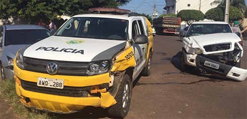 Parece que a Polícia Militar tá precisando de uma “benzida” nas viaturas da região. Em uma semana duas se envolveram em acidentes. A primeira foi em Campo Mourão. A segunda, nesta quarta-feira, foi em Goioerê (foto). Uma camionete invadiu a preferencial, bateu na viatura na Rotam que, por sua vez, atingiu outro carro. Menos mal que ninguém se feriu. Em todo caso, se alguém conhecer um benzedor...