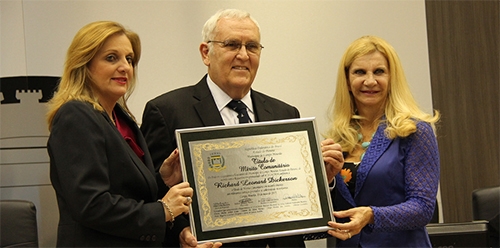 A autora da homenagem, Nelita Piacentini, e a prefeita Regina Dubay entregaram o título a Dickerson. O reverendo é norte-americano, mas está há 38 anos no Brasil. E olha que ele só veio pra ficar três meses...