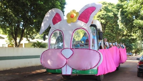 Mais de 1,2 mil caixas de bombons foram entregues a alunos das escolas municipais de Juranda. Os servidores municipais também foram presenteados com os chocolates. A distribuição foi feita pela prefeitura. Várias municípios da região fizeram o mesmo. A diferença em Juranda foi a presença do "Coelhão", que é esse ônibus com cara de coelho da Páscoa. Ah, coelhinho é para os fracos...