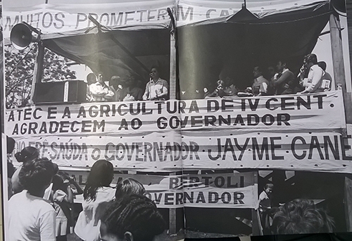 A foto acima é uma reprodução das duas páginas que abrem o livro “No tempo do Canet – A historia do Paraná na década de 1970”. E o que é que a gente tem a ver com isso? Tem que o clic foi feito na região, quando o então governador Jaime Canet inaugurou a pavimentação da estrada ligando Goioerê ao então distrito de Quarto Centenário. “Muitos prometeram. Canet fez”, dizia a faixa sobre o palanque. Hummmmm...