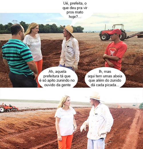 Os cliques são desta sexta-feira, quando a prefeita Regina Dubay foi dar uma olhada no trabalho de conservação de estradas rurais. Junto com o secretário César Stanziola (Obras e Serviços Públicos), ela esteve na região do Alto São João, no distrito de Piquirivaí. Portanto, bem longe do apitaço dos servidores em greve...