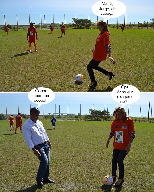 Os cliques são de domingo passado, quando houve a inauguração da revitalização do campo de futebol do jardim Silvana. A prefeita Regina Dubay não jogou, mas de salto e tudo deu os seus chutões. O vereador Jorge Pereira também esteve por lá.