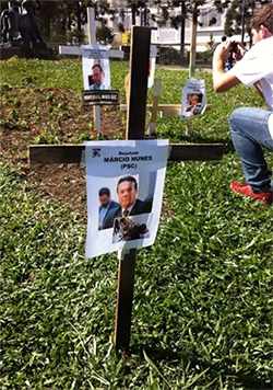 O Centro Cívico, em Curitiba, virou um cemitério nesta sexta-feira, em protesto dos professores estaduais. Eles colocaram cruzes simbolizando cada um dos deputados que votaram a favor do projeto que mexeu na Paraná Previdência. Cada cruz trazia o nome do deputado, o partido, uma foto dele e de uma cena do “massacre” de quarta-feira. O deputado mourãoense Márcio Nunes também ganhou sua cruzinha.