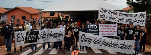 Professores estaduais levaram faixas contra o governo do Estado na inauguração de casas populares em Goioerê, na sexta-feira. Na hora do discurso do presidente da Cohapar, Abelardo Lupion, eles ficaram de costas para o palanque. Os vereadores Neide Sena e Herley Paraíba, que são professores, estavam no protesto, mas foram chamados para compor o quadro de autoridades.