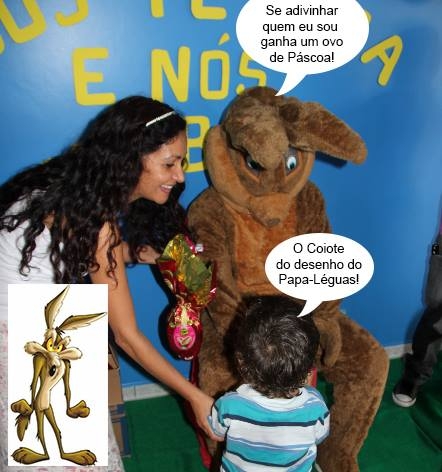 Crianças e adolescentes atendidos pelo Centro de Referência Especializado da Assistência Social de Campo Mourão participaram de confraternização especial de Páscoa. Foi nesta quinta-feira na Aerfen. Um "coelho" apareceu por lá e distribuiu ovos de chocolateo para a criançada. Legal. Mas que o tal do coelho parece o Coiote do desenho do Papa-Léguas, parece!...
