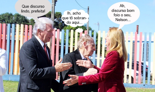 O clic é desta sexta-feira, na cerimônia de inauguração da Super Creche do jardim Indianópolis (Lar Paraná). Após os discursos, o ex-prefeito Nelson Tureck e a prefeita Regina Dubay se cumprimentam. Já o ex-vice-prefeito Munir Karam deixa a cena de fininho.