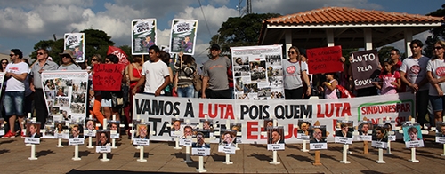 Os professores estaduais em greve levaram seu “cemiterinho” para a inauguração do posto do Detran. Sem políticos do governo do Estado por lá, o protesto foi silencioso. Teve um “eu tô na luta” entre um discurso e outro e, é claro, o “fora, Beto Richa” no fim do evento.