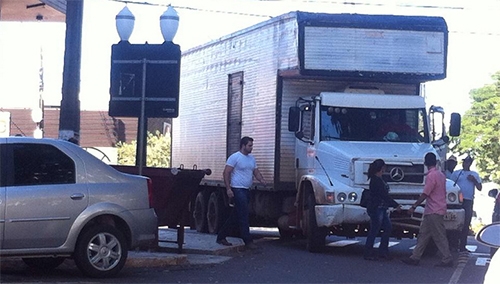 “Por volta das 11h30 desta terça-feira, caminhão baú se envolve em acidente do centro de Campo Mourão. Foi na esquina da av. Capitão Índio Bandeira com a rua Harrison José Borges. Caminhão no lugar errado, na hora errada dá nisso...” Foto: Carlos André