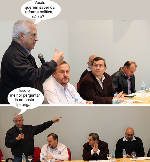 Além de Eraldo Teodoro, que é do PMDB, os vereadores Edilson Martins (PSD) e Professora Vilma (PT) foram à reunião. Edilson ficou pouco, mas Vilma ficou até o fim, com direito a assento na mesa principal.