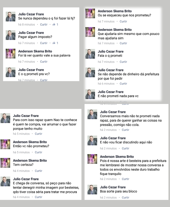 Não convidem para a mesma mesa o prefeito de Peabiru, Júlio Cezar Frare, e o carnavalesco Anderson “Skema” Brito. Os dois travaram um bate-boca pelas redes sociais. Começou quando Skema reclamou de um “chá de cadeira” que levou na prefeitura e acusou Frare de não cumprir a promessa de ajudar seu bloco de carnaval, que este ano vai homenagear uma escola municipal. O prefeito respondeu que não prometeu nada e ironizou, perguntando se Skema tinha ido à prefeitura pagar imposto. Confira acima os “melhores momentos”.