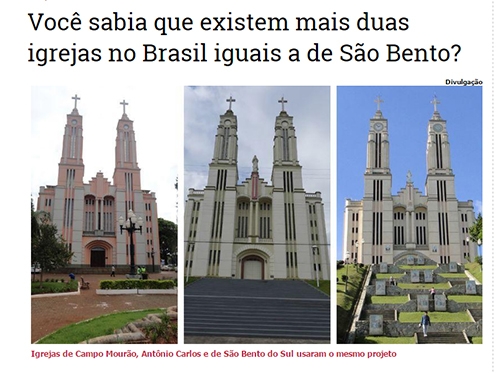 Jornal A Gazeta, de São Bento do Sul/SC, publicou matéria sobre os projetos iguais das igrejas de lá, de Campo Mourão e de Antônio Carlos/SC. “O arquiteto alemão Simão Gramlich, responsável pela idealização da igreja, reaproveitou seu trabalho e vendeu o projeto para outros dois municípios: Campo Mourão, no Paraná, e Antônio Carlos, em Santa Catarina”, frisa o texto. Aqui na Boca Santa, há alguns anos, a semelhança das igrejas já rendeu até um “jogos dos sete erros”.