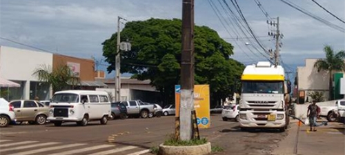 O clic desta quinta-feira, no centro de Campo Mourão, mostra carreta parada sobre a calçada. Dentro das seções deste Site, qual título caberia melhor pra foto?