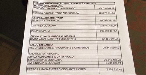 Também teriam ficado dívidas a curto prazo empenhadas de R$ 6,7 milhões, mas ainda a vencer.