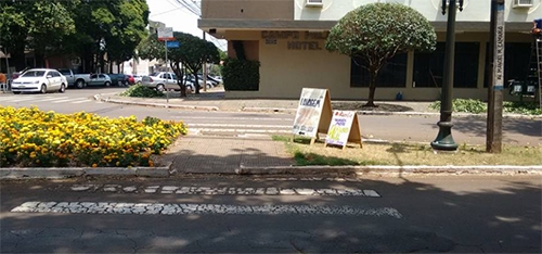 Placas com propaganda colocadas em canteiro central da av. Manoel Mendes de Camargo, no centro de Campo Mourão. Já imaginou se toda empresa se achar nesse direito, o que vão virar os canteiros?