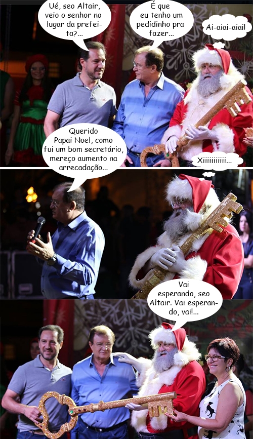 Os cliques são desta sexta-feira, durante a chegada do Papai Noel a Campo Mourão. Além do “bom velhinho” estão na foto o presidente da Acicam, Paulo César Costa, o secretários Altair Casarim (Fazenda), que repressentou a prefeita Regina Dubay, e a ex-secretária da Cultura, Sônia Singer, que mesmo já fora do cargo, participou dos preparativos do evento.