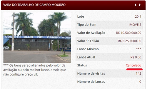 Foi cancelado o leilão do Country Clube de Campo Mourão, que tinha sido marcado pela Vara do Trabalho para esta quarta-feira. O clube, com área de 33,9 mil m2, foi avaliado em R$ 10,5 milhões e poderia ser arrematado a partir de R$ 5,2 milhões. Outros sete lotes também foram cancelados, mas o leilão está mantido com 27 lotes, incluindo um área rural em Quinta do Sol avaliada emR$ 30,5 milhões e que vai a remate a partir de R$ 15,2 milhões. Será no hotel Tonello (9h).