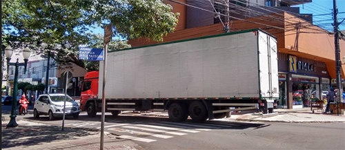 Às 11h desta segunda-feira, caminhão-baú passa pelo centro de Campo Mourão. Ele não conseguiu fazer a curva e precisou de manobras para entrar na rua Harrison José Borges.