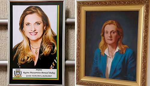 Depois do quadro na galeria dos ex-prefeitos, na recepção do gabinete, a prefeita Regina Dubay foi parar também na galeria existente no hall de entrada da prefeitura. No gabinete é uma pintura e na entrada uma foto. Regina é a primeira mulher a ser prefeita de Campo Mourão. As duas galerias têm algumas diferenças. Por exemplo: na pintura todos os prefeitos apreceram sérios. Na fotos é permitido um sorrisinho. Dá pra dizer que a foto é do início do mandato e a pintura do fim...