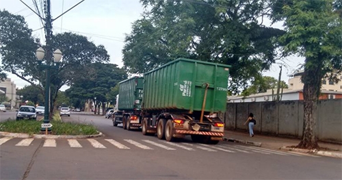 “Carreta bitrem atravessa o centro de Campo Mourão pela av. Irmãos Pereira”.