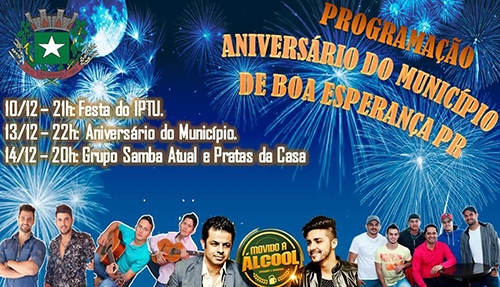 Boa Esperança vai completar 52 anos de emancipação na próxima quarta-feira. Para comemorar, a prefeitura anunciou shows em praça pública. Começa neste sábado, com a dupla Lucas Souza & Henrique. Será depois da “Festa do IPTU”, que sorteará prêmios, incluindo uma moto 0 km, para quem pagou o imposto em dia este ano. Também haverá shows na terça e na quarta-feira à noite. Tudo na praça Orando Poppi.