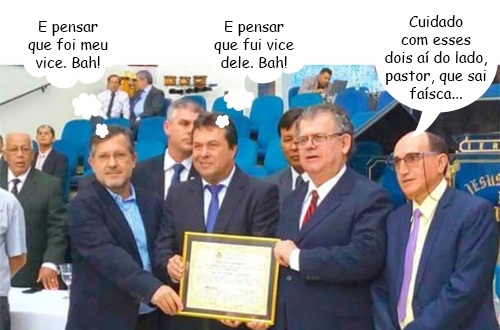 O clic é desta quinta-feira, quando a Câmara entregou moções a pastores da igreja Assembleia de Deus. A entrega aconteceu na própria igreja e colocou lado a lado o prefeito eleito Tauillo Tezelli (PPS) e o deputado Márcio Nunes (PSC). Os dois já foram prefeito e vice-prefeito (97/00), mas ultimamente andam em lados diferentes da política.