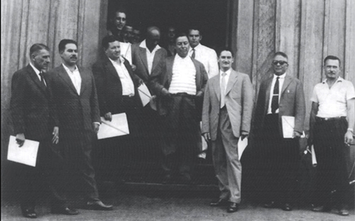 15 de novembro de 1959. Diplomação do prefeito e vereadores eleitos em 4 de outubro. Da esquerda: João Fenianos, Alfeu Teodoro de Oliveira, Antônio Bittencourt Franco, Ermenegildo Dolci (mesário), Fioravante João Ferri, Antônio Teodoro de Oliveira (prefeito eleito), Joaquim Euzébio Figueiredo (juiz), Lary Calisto Razzolini, Francisco José da Silva e Wille Bathke.