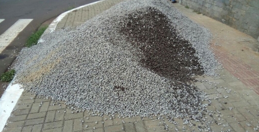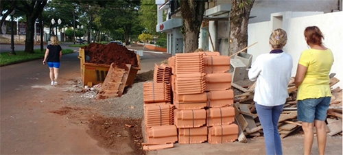 “Na av. Jorge Walter, centro de Campo Mourão, materiais de construção e entulho tomam conta da calçada e ao pedestre resta se arriscar andando pelo meio da via”.