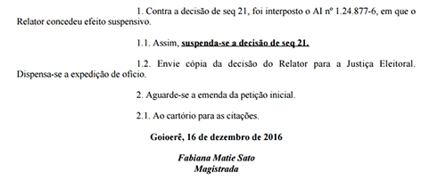 A juíza Fabiana Matie Sato, de Goioerê, recebeu a decisão do tribunal nesta sexta e comunicou a Justiça Eleitoral.