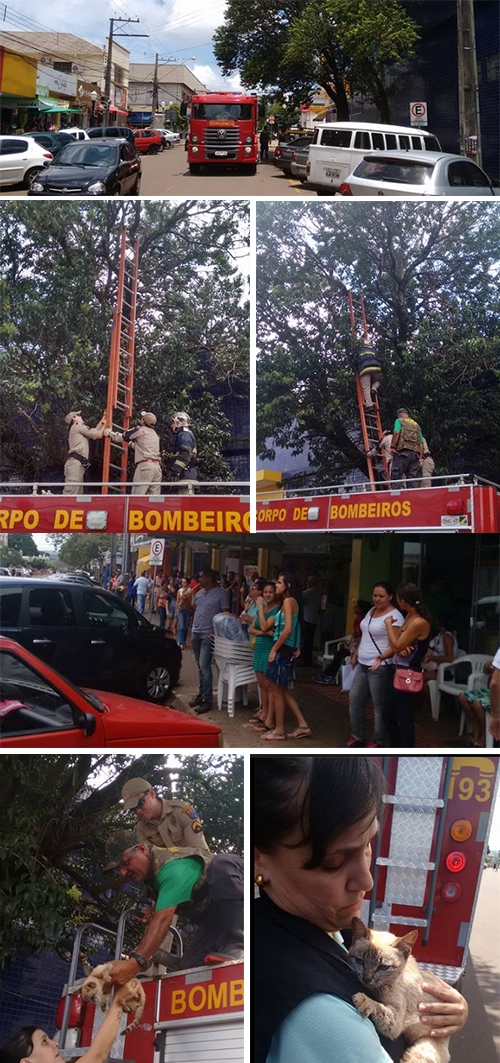 Viatura do Corpo de Bombeiros parada na contramão, no meio da rua São Paulo, no centrão de Campo Mourão. Nas esquinas, cones e policiais militares paravam o trânsito. Na sombra das marquizes das lojas, uma multidão acompanha tudo apreensiva. Motivo? Uma gatinha, bem debilitada, tinha subido no alto de uma árvore e não conseguia descer. Os bombeiros fizeram os resgate e saíram aplaudidos. O público não escondeu a emoção. Mais uma prova que ainda dá pra acreditar na humanidade.