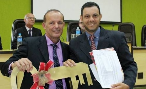 Albano foi eleito presidente da Câmara neste domingo e recebeu a chave simbólica da prefeitura do ex-prefeito Luiz Volpato.