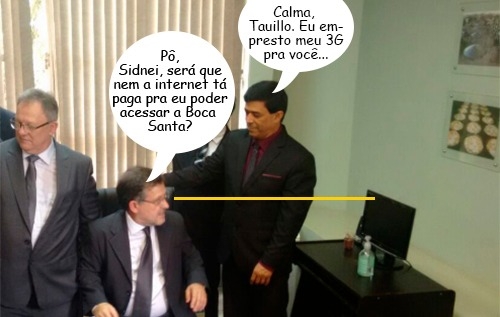 O clic é deste domingo, quando o prefeito Tauillo Tezelli voltou a sentar na cadeira de prefeito de Campo Mourão. Os vereadores Edson Battilani e Sidnei Jardim, ambos do PPS, estão com ele, mas o prefeito tá de olho é no computador desligado.