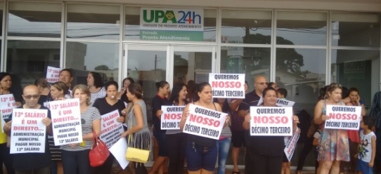Apesar de a prefeitura informar pela manhã que tinha cancelado a entrega da UPA, um grupo de servidores seguiu no local com cartazes em protesto contra o não pagamento da segunda parcela do 13.o salário.
