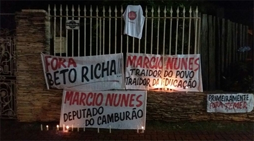 Professores da Unespar e da rede estadual, além de estudantes, protestaram nesta segunda-feira à noite em frente ao escritório regional do deputado Márcio Nunes, no centro de Campo Mourão. Ele levaram faixas e acenderam velas. Tudo para pressionar o deputado a votar contra a proposta do governador Beto Richa que cancela o reajuste dos servidores estaduais no ano que vem. O projeto deve ir à votação na Assembleia Legislativa a partir desta terça-feira.
